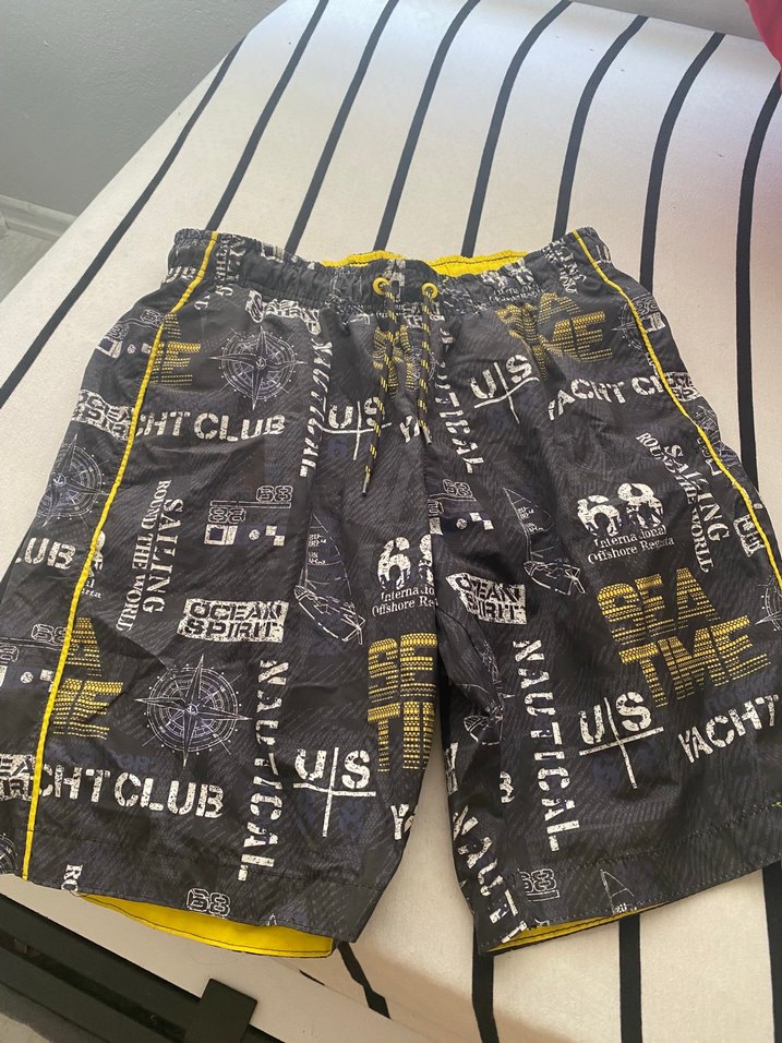Gri ve sarı renklerde, baskılı deniz temalı desenlere sahip, kemerli ve bol kesim erkek mini deniz şortu.