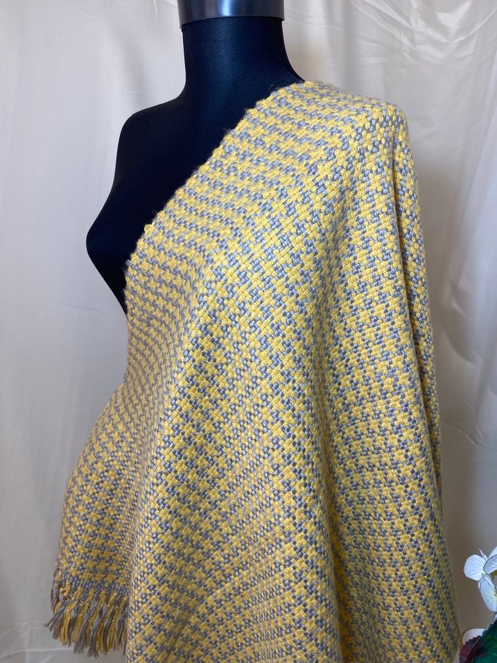 Sarı ve gri renkli, dokuma tezgahında yapılmış kaz ayağı model şal ve bere satıştadır. Standart ölçüye sahiptir.