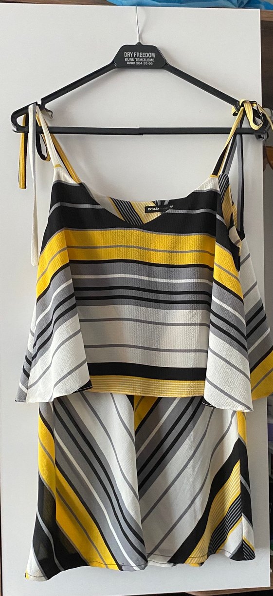 Sarı ve gri çizgili, askılı, salaş kesim bluz. Kullanılmadı 36/S beden