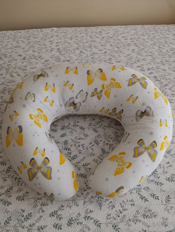 Sarı ve gri melek desenli, hamilelik ve emzirme döneminde rahatlık sağlayan yumuşak yastık. ️çok az kullanıldı. e bebek ürünüdür.