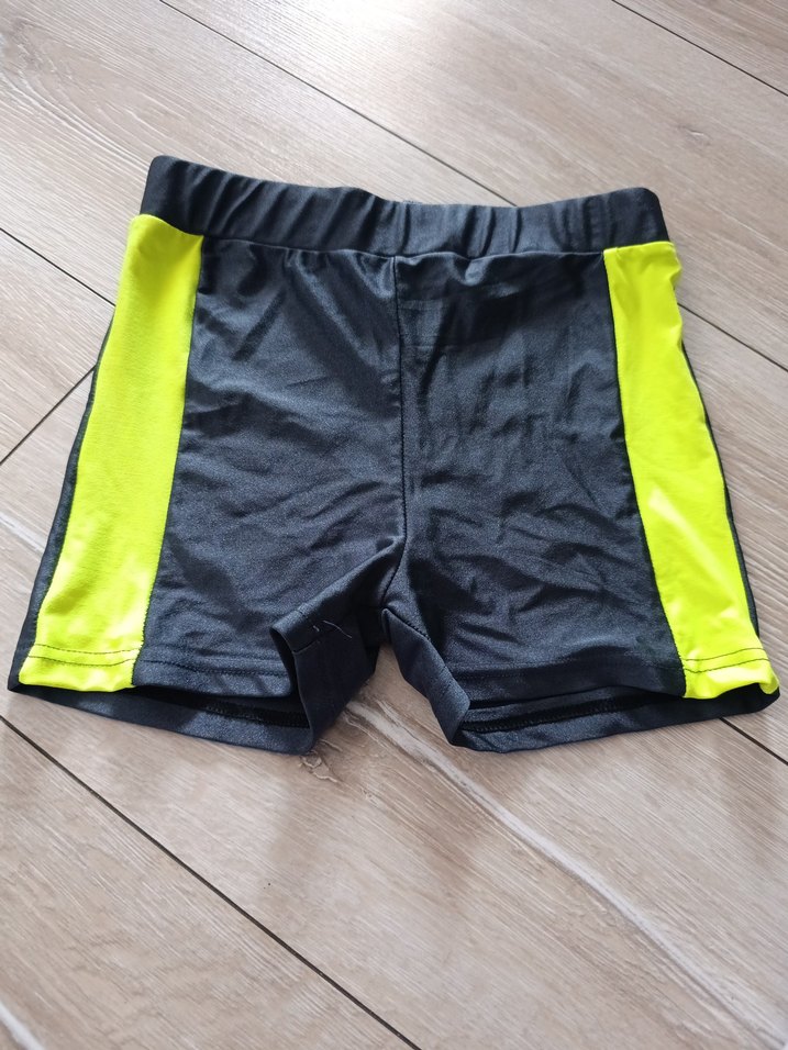 Gri renkte, yanları parlak sarı şeritli, elastik bel bantlı erkek çocuk yüzme şortu. 12 yasa kadar uygunslipmayo