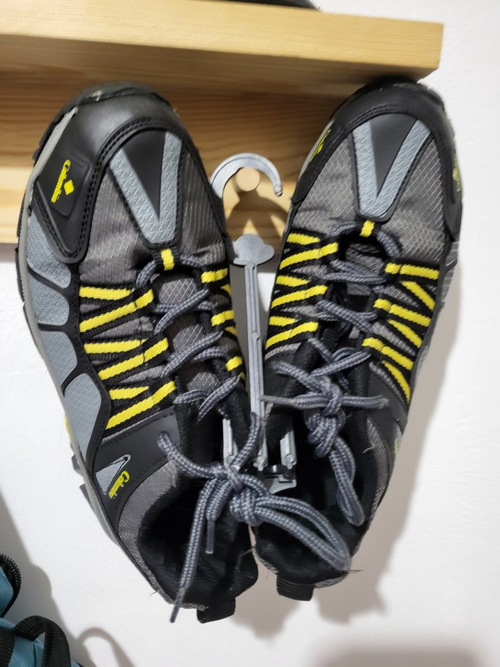 Gri ve sarı renkli, lastik tabanlı erkek su ayakkabısı. bağcıklı ve baskılı biker tarzı, spor ve athleisure için uygun. ️ 37 numara