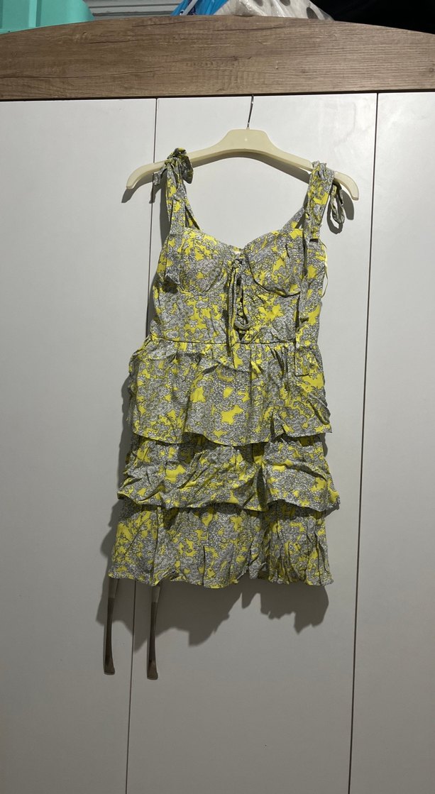 Sarı ve gri tie-dye desenli, fırfırlı katmanlara sahip, askılı ve kısa boy bohem tarzı elbise