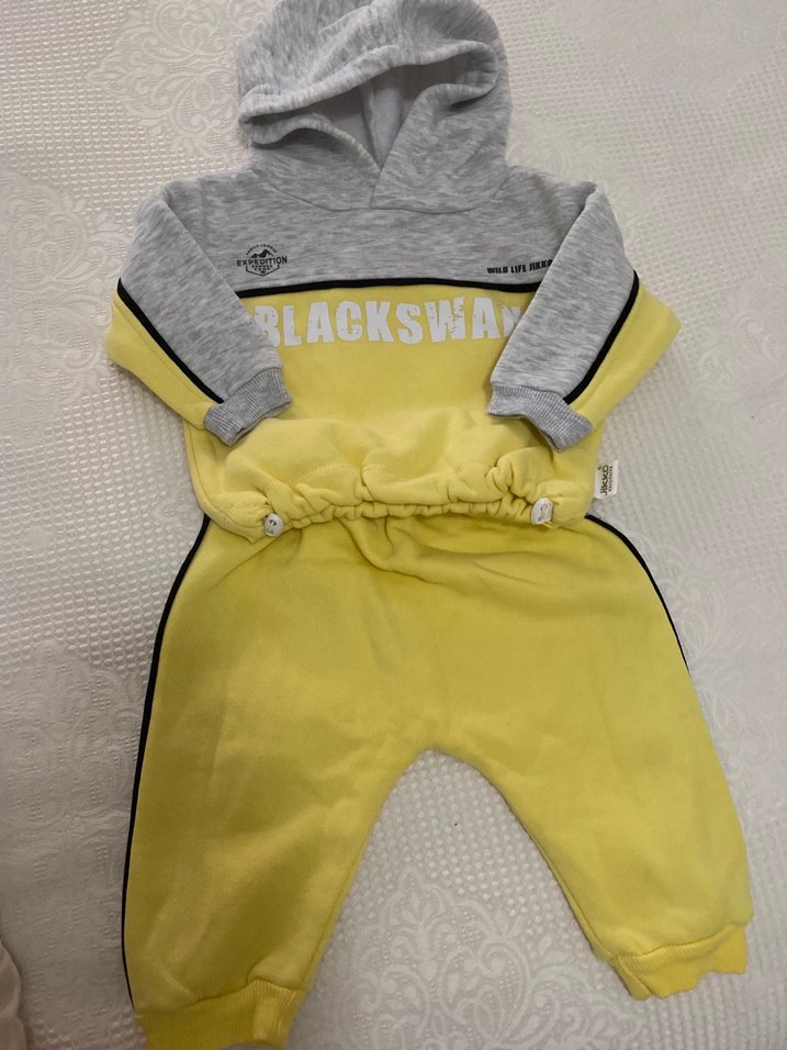 Kapüşonlu, uzun kollu gri ve sarı üst, "BLACKSWA" baskılı. Sarı pantolonlu, yumuşak ve sıcak kumaşlı bebek takımı. Bır kez gıydırdim hiç bir yerinde sorun yok