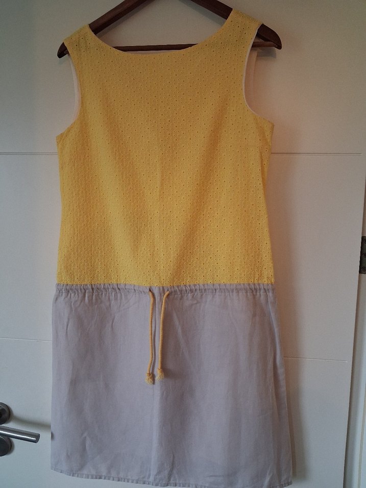 Sarı üst kısmı ve gri alt kısmı kemerli, nefes alabilen keten kumaştan yapılmış, bol kesimli kolsuz midi elbisedir.