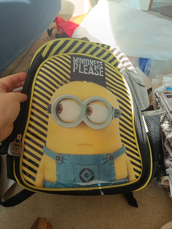 Sarı ve gri renklerde, üzerinde "PLEASE" yazan Minion desenli çocuk okul çantası. Dayanıklı yapıda ve ayarlanabilir askılıdır. #anaokulcantasi