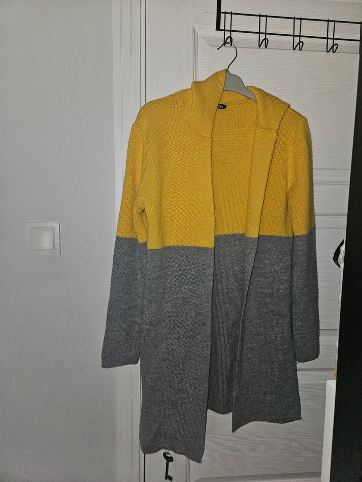 Örgü yün hırka, bol kesim ve yakalıdır. Sarı ve gri renklerin birleştiği uzun kollu, midi boy rahat ve gündelik tarzda bir üründür.