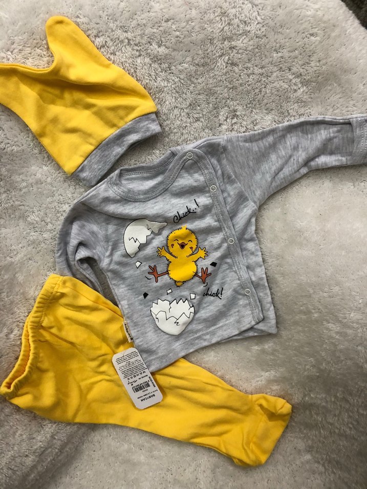Gri uzun kollu, civciv baskılı üst, sarı örme pantolon ve şapka içeren bebek takımı. Yumuşak ve sıcak kumaştan, yuvarlak yakalı.
