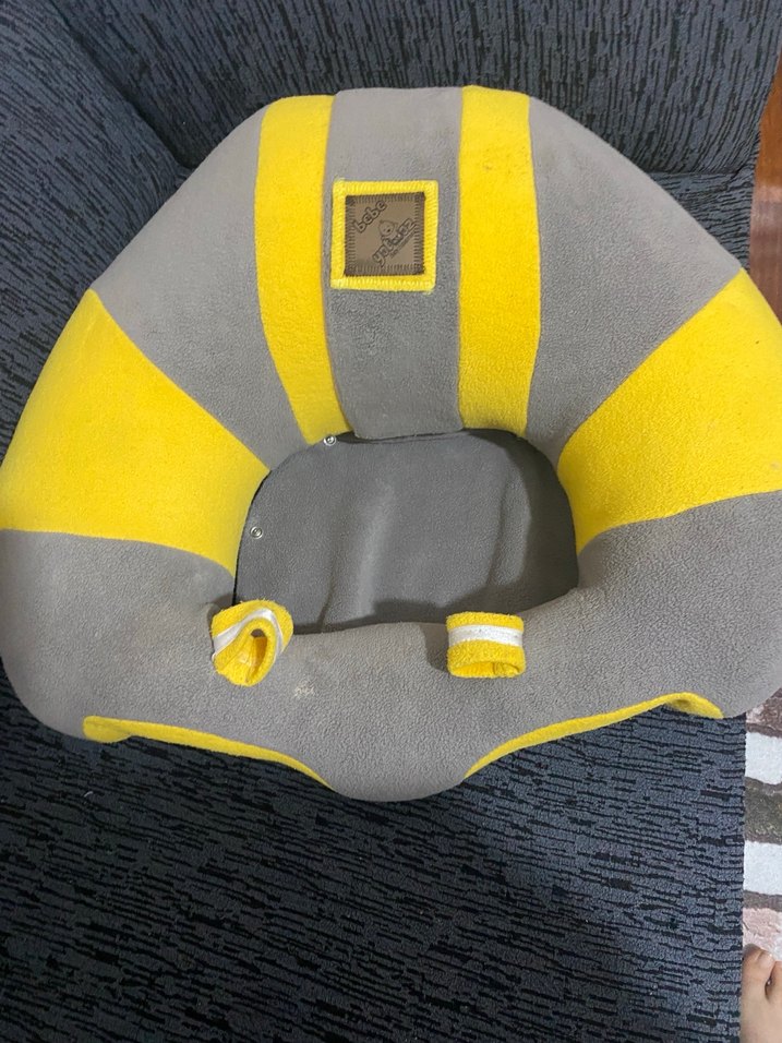 Sarı ve gri renklerde, yumuşak dolgulu bebek minderi . Oturmaya geçen bebekler rahatlıkla kullanır.