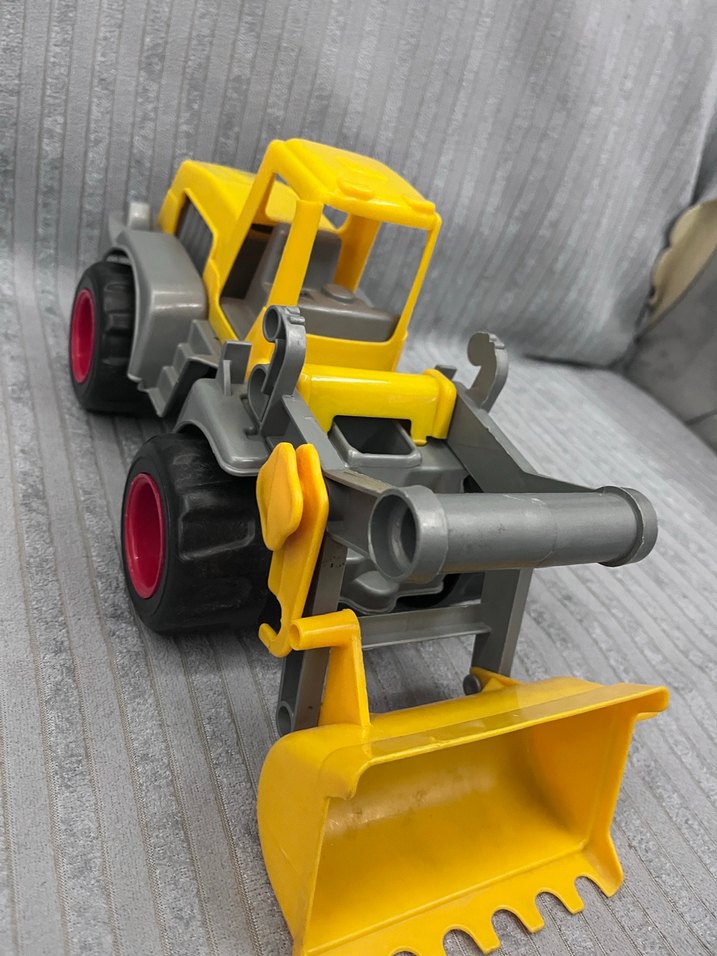Kırmızı tekerlekli, ön kepçeli sarı-gri oyuncak kepçe. Oyun için detaylı parçalara sahip.