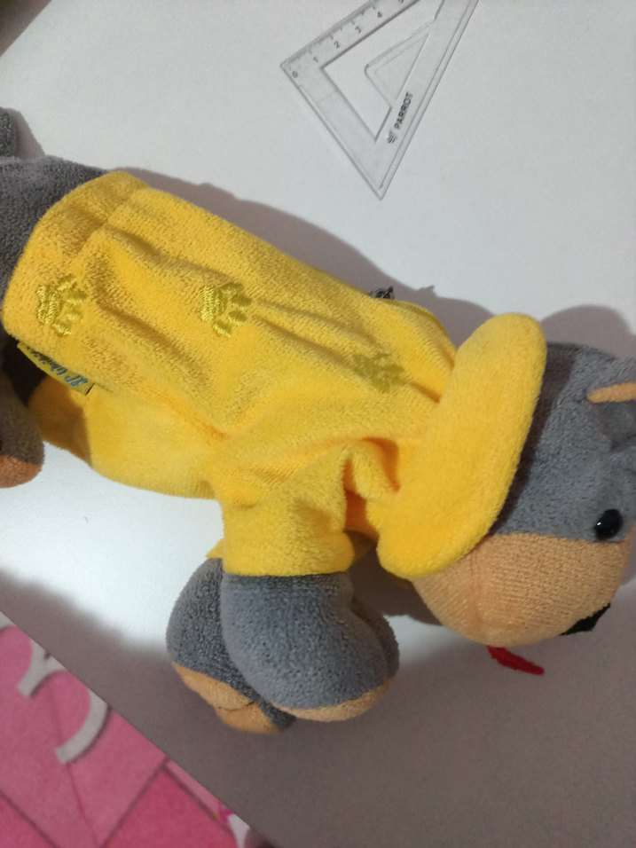 Sarı gövde ve gri uzuvlara sahip, basit nakış detaylı yumuşak peluş oyuncak. kalemlikkk temiz az kullanılmış