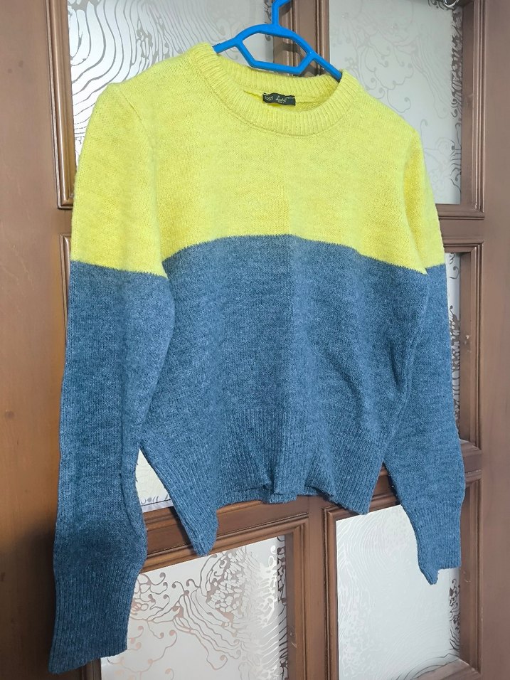 Sarı ve gri renklerde, yuvarlak yakalı, uzun kollu, bol kesim triko kadın kazak.