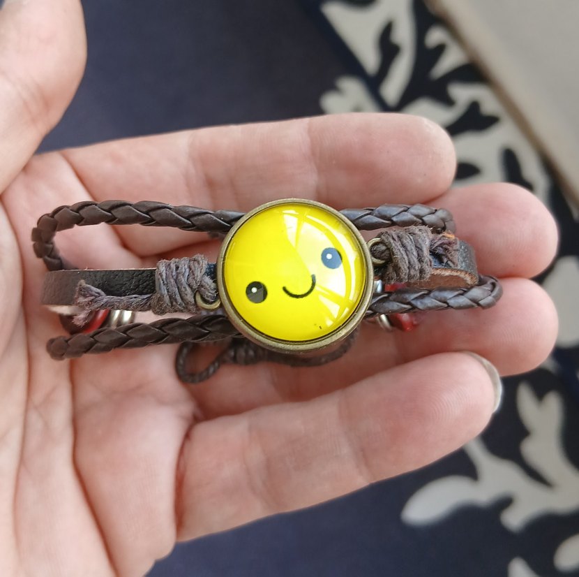 Sarı gülümseyen yüz figürlü, kahverengi örgü deri kayışlı erkek bileklik, renkli ve retro tarzıyla grunge punk havası katıyor.