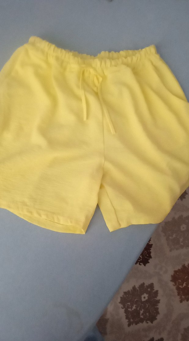 Yumuşak keten kumaştan, bol kesim sarı hamile mini şort. Rahatlık için lastikli bel ve bağcık detaylı. Günlük sokak stili için uygun.