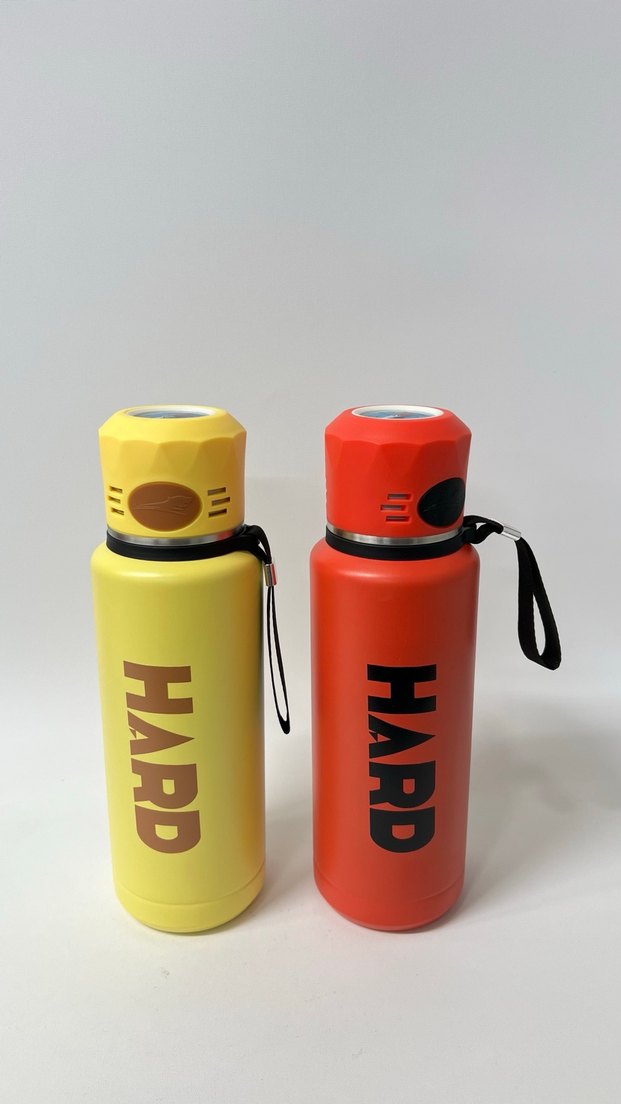 Canlı sarı renkte, sağlam kapaklı ve taşıma askılı HARD yazılı çocuk termosu.