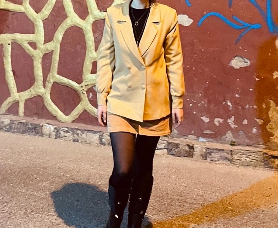 Hardal rengi düğmeli kadın blazer. Notlu yaka ve uzun kollu. Kolunun arka kısmında leke vardır kuru temizleme ile çıkacaktır.