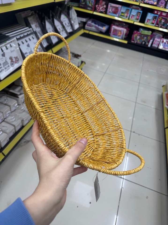 İki saplı sarı hasır sepet, uzun oval şekliyle küçük eşyalar için uygundur. Renkli ve doğal görünümüyle mekana şıklık katar.