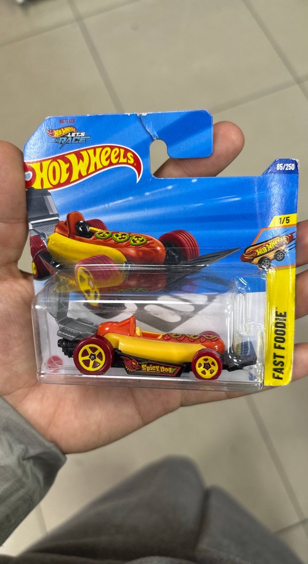 Renkli Hot Wheels oyuncak araba, sarı gövde ve kırmızı-siyah detaylara sahip. Fast Foodie serisinden 1/5 numaralı modeldir. Canlı renkli tekerlekleri ve benzersiz tasarımı var.