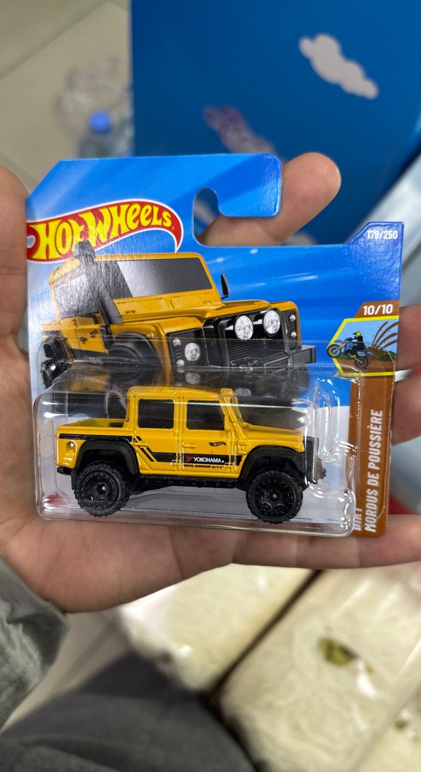 Detaylı tasarımlı ve dayanıklı lastikli sarı Hot Wheels off-road oyuncak araba, orijinal ambalajında renkli görünüme sahip.