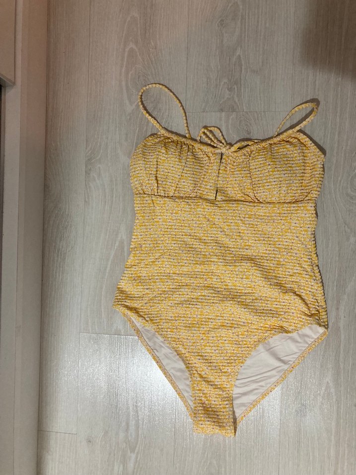 Sarı renkli, ince askılı ve çiçek desenli mayo