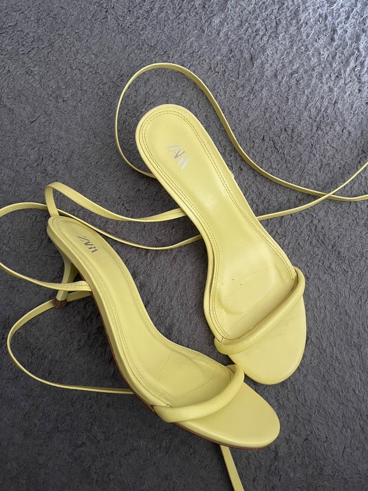 Yumuşak kauçuktan yapılmış, tokalı bantlı sarı ince topuklu sandalet. Minimalist ve çağdaş stil, romantik akşamlar için uygun.