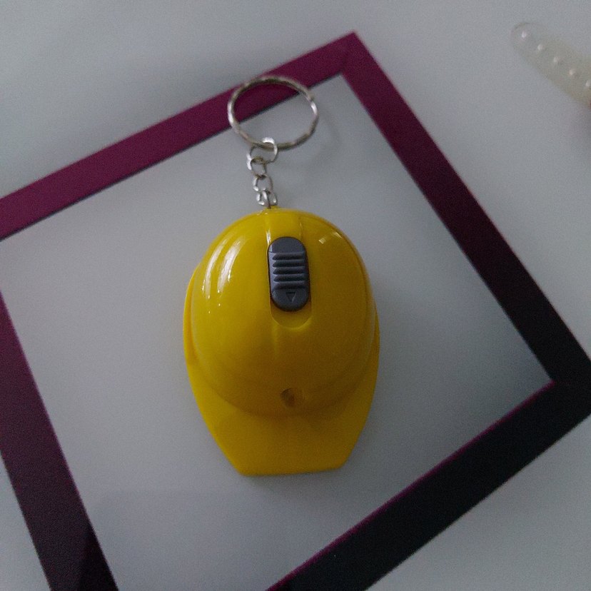 Sarı renkte inşaat kaskı şeklinde anahtarlık, üzerinde basit bir düğme ve metal halka bulunur. Minimalist ve renkli bir aksesuar seçeneği sunar. acacak ledli kullanisli bir anahtarlik