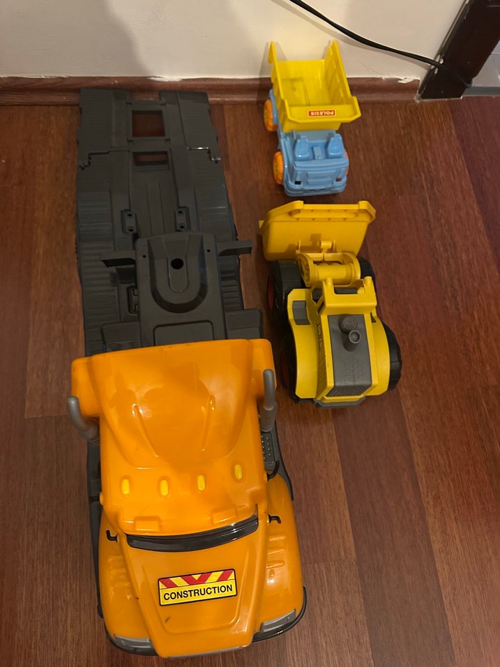 Sarı renkte, "CONSTRUCTION" yazılı oyuncak inşaat kamyonları seti, damperli kamyon ve silindir içerir. Tır eksık parcaları var buyuk boy
