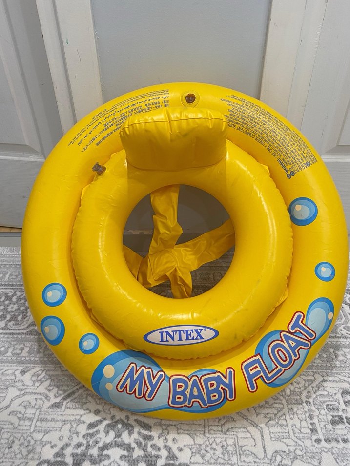 Sarı renkli Intex bebek yüzme simidi, güvenli oturma alanı ve sırt dayanağı ile su aktiviteleri için uygundur. Renkli ve "FLOAT, INTEX, BABY" yazılıdır. ️