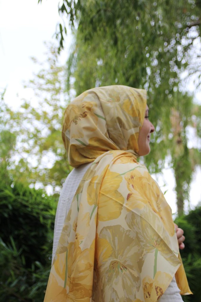 Diger markasının tasarıma sahip, hafif sarı renkte ve ipek görünümlü dokusuyla kadın şalı, mütevazı bohem tarzı için uygundur.
