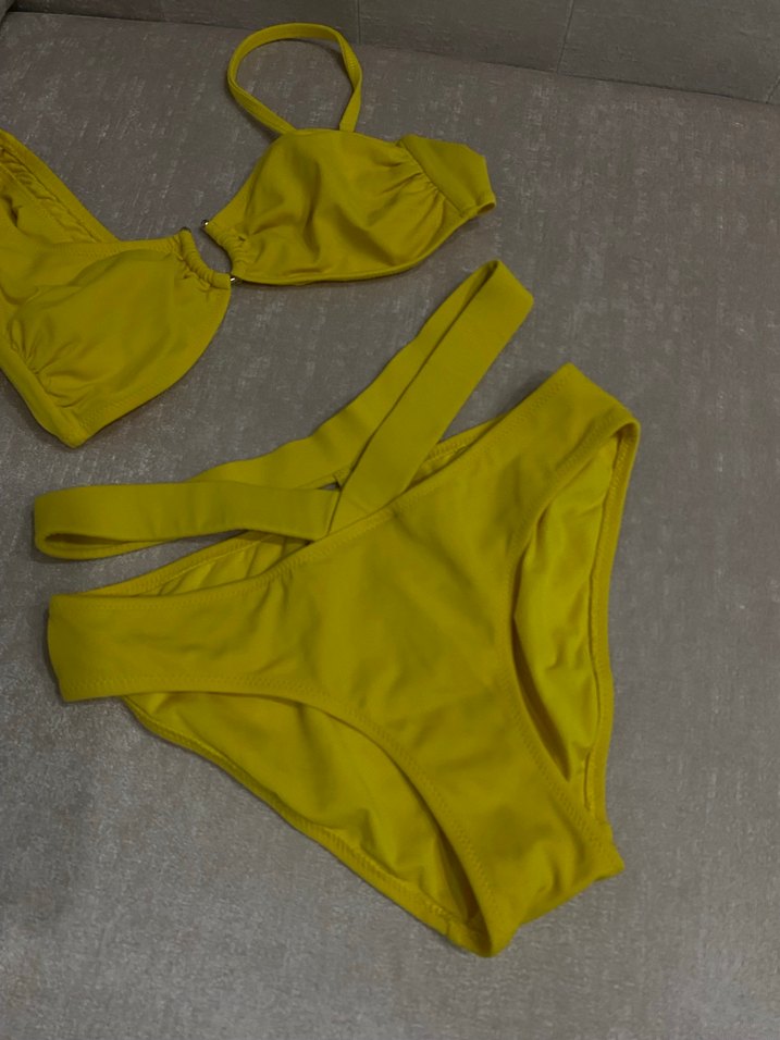 Sarı renkli, ipli askılı ve vücuda oturan kesime sahip kadın bikini. Desensiz ve midi boyuyla plajda rahat ve şık bir görünüm sunar.