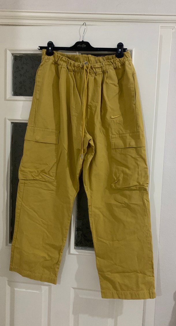 Sarı renkli, keten kumaştan loose fit erkek pantolon. Beli ipli ve midi boyda, günlük kullanıma uygun rahat bir model.