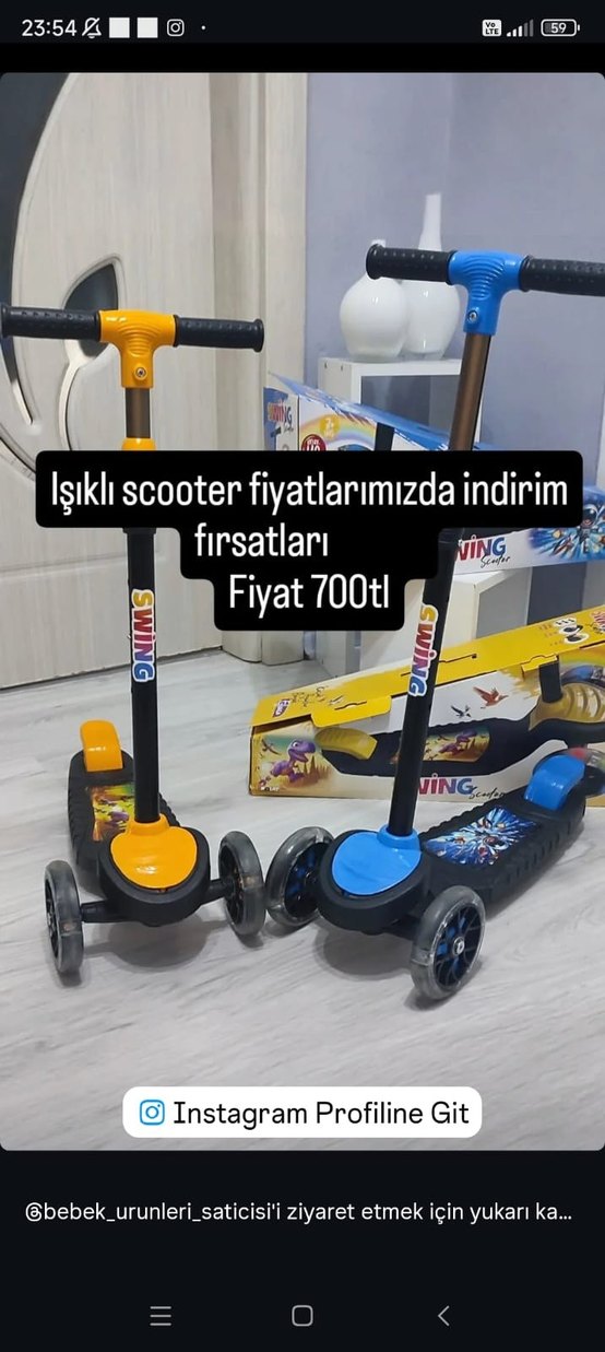 Sarı renkte ışıklı çocuk scooterı, sağlam tutma kolu ve üç tekerlekli denge sistemi ile. Fiyatı 700 TL, indirim fırsatları mevcut.