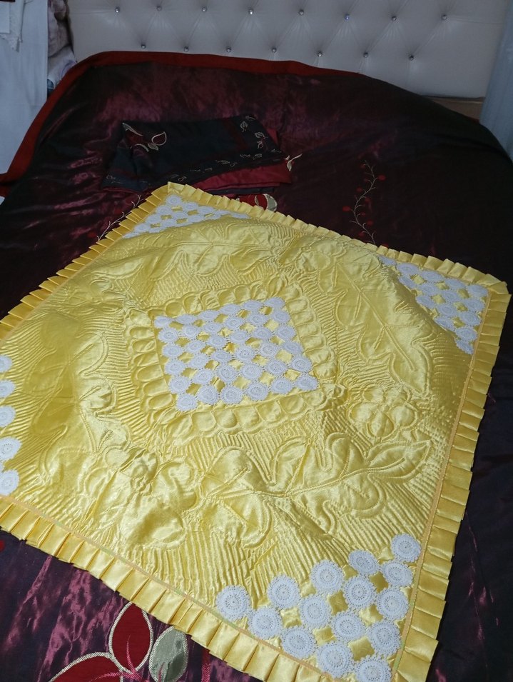 Parlak sarı renkli, işlemeli desenlere ve beyaz süslemelere sahip tekstil bebek battaniyesi. Yumuşak ve rahat kullanım sağlar. astarli