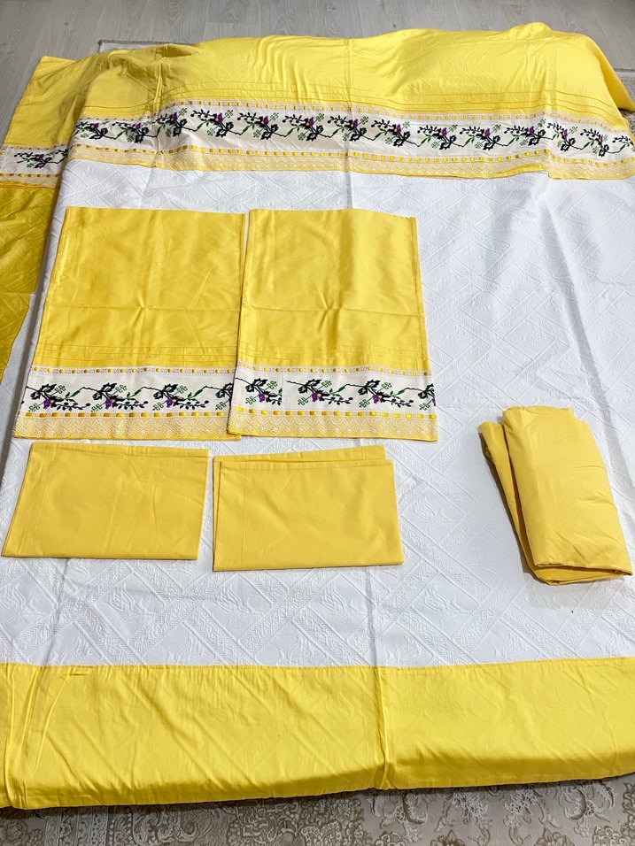 Açık sarı işlemeli çiçek desenli nevresim takımı,el yapımı sıfır ürün .Kumaş kalitesi ömürlük