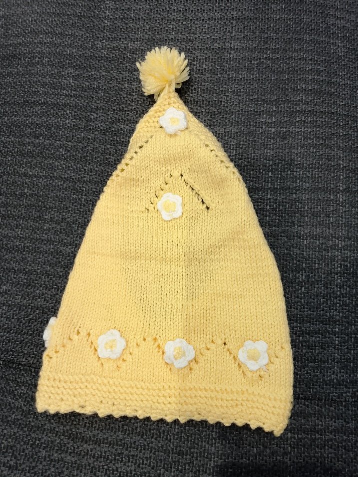 Sarı renkli, işlemeli beyaz çiçeklerle süslenmiş, üstünde ponpon bulunan örgü çocuk bere. Retro ve bohem tarzda.
