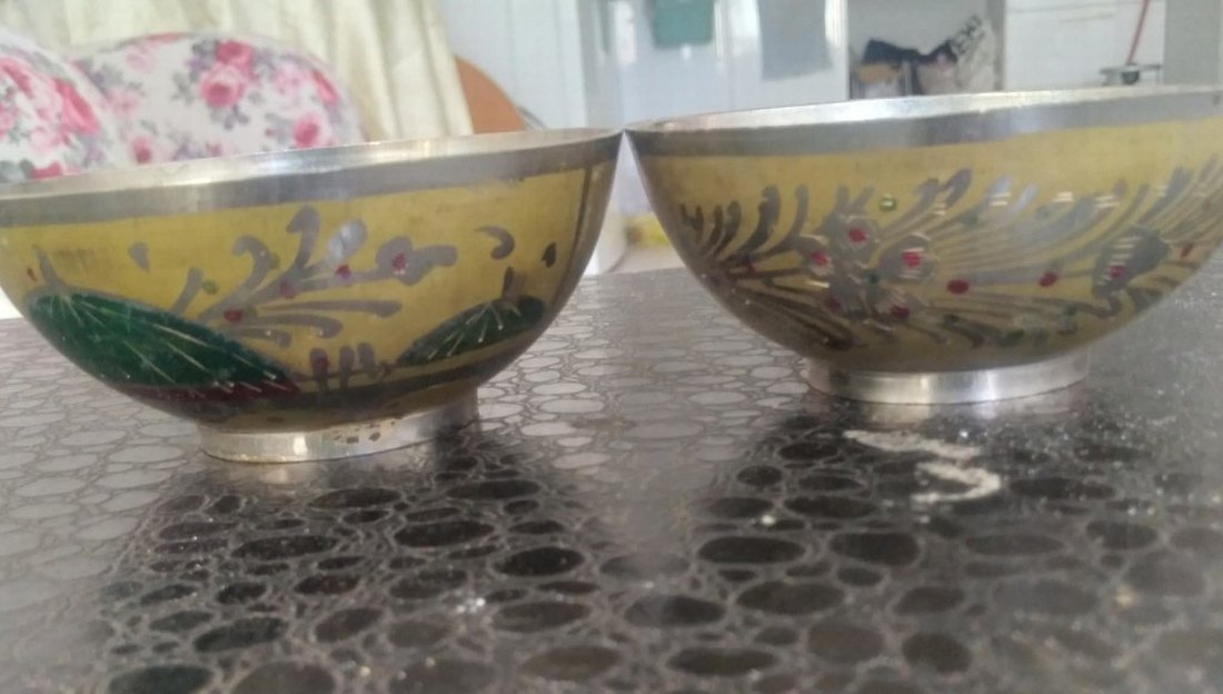 Parlak sarı renkte, işlemeli desenlere ve metal kenara sahip geleneksel tarzda çelik kaseler. İkisinin fiyatıdır