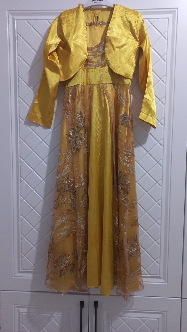 Sarı işlemeli uzun elbise .Retro tarzlar için uygun, düğünlerde tercih edilebilir.