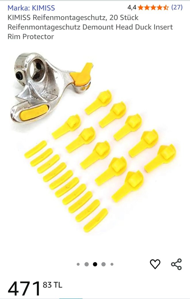 KiMISS sarı jant koruyucu seti, lastik takarken jantları korumak için 20 parçadan oluşur. Demount head duck insert içerir. ️ lastik sökme-takma makinesi için koruyucu aparatlar setidir. Üstteki metal parça “duck head” (ördek başı) denilen sökme takma kafasıdır. Lastik değişim makinelerinde jant kenarından lastiği sökmek için kullanılır. Sarı parçalar ise koruma plastikleridir. Bu plastikler metal kafanın jant ile temas ettiği noktalara takılır. Böylece jantın boyası ya da yüzeyi çizilmez, hasar görmez. Özetle: Görevi lastik takma-sökme sırasında jantı çizilmelere ve darbelere karşı korumaktır. Özellikle alüminyum alaşım (tırnaklı, parlak veya özel boyalı) jantlarda çok işe yarar. Diğer tüm özellikler son resimde mevcuttur. Stok:2