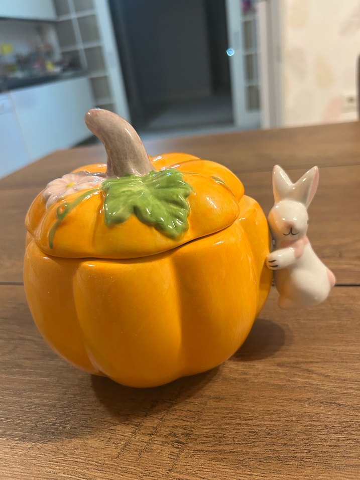 Pastel sarı kabak şeklinde dekoratif kutu, küçük tavşan figürü ile tamamlanmış. Her mekana sevimli bir dokunuş katar. Yurt dışı ürünüdür küçük bir parça değil