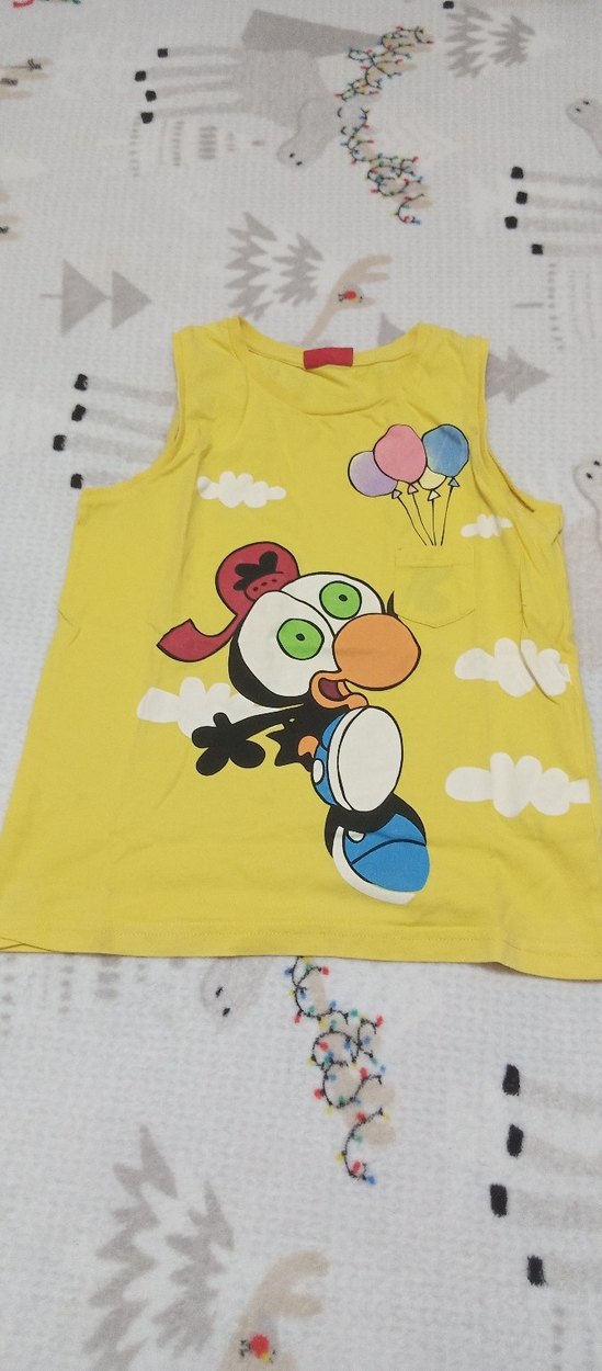 Sarı renkte, pamuklu kumaştan yapılmış kolsuz kız tişörtü. Kabartmalı detaylı, renkli pop kültür baskısı ve rahat kesimiyle dikkat çeker.