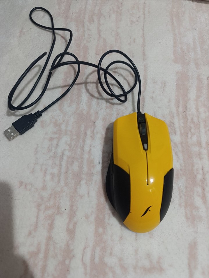 USB bağlantılı, sarı ve siyah renkli kablolu bilgisayar mouse'u. Kaydırma tekerleği ve ergonomik tasarıma sahiptir. ️