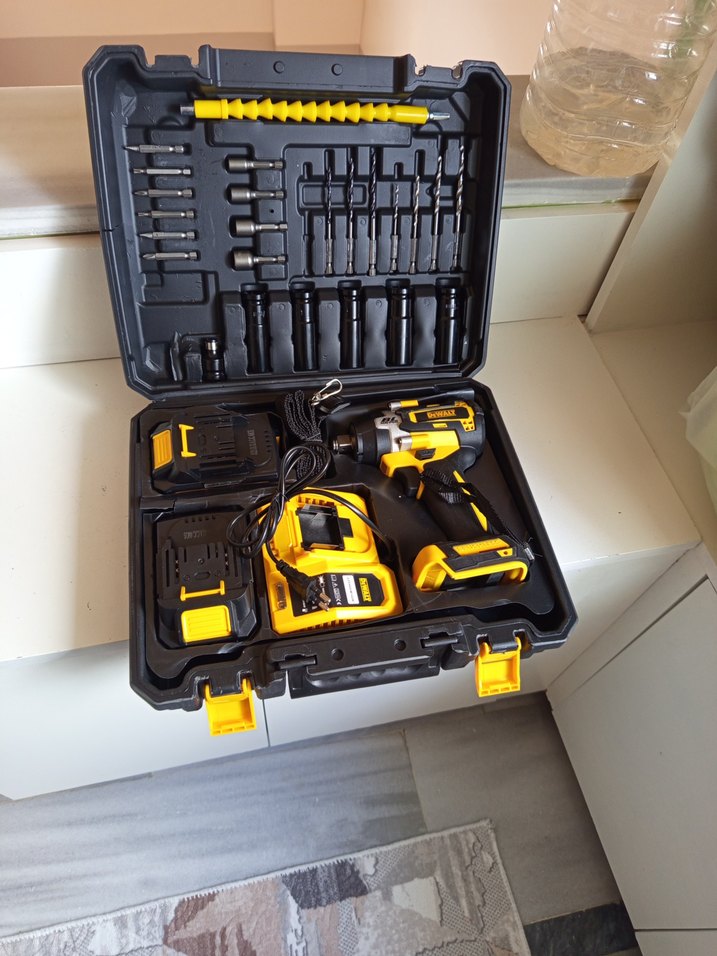 Sarı kablosuz matkap seti, dewalt ful setli çeşitli uçlar, iki pil ve şarj cihazı ile sağlam siyah taşıma kutusunda.