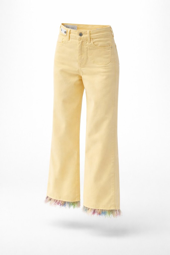 Püsküllü detaylar ve hafif batik desenli, pamuklu, bol kesim sarı kız pantolonu. Rahat ve gündelik tarzda.