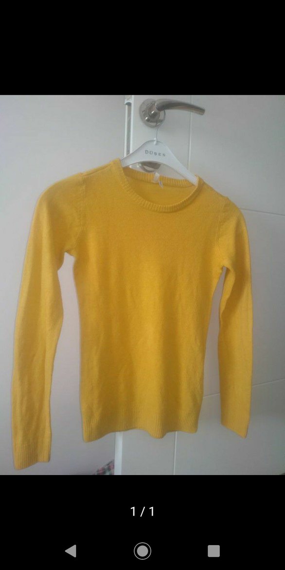 Bu sarı yün kazak, bisiklet yaka ve uzun kollu olup, sade ve minimalist tarzda örülmüştür, günlük kullanıma uygundur.