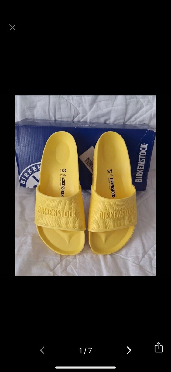 Sarı kadın Birkenstock terlik, bantlı ve blok topuklu, kauçuk malzemeden üretilmiş, plaj ve sokak stiline uygun, desensiz ve açık renkli. 1 kez kullanılmıştır defosuz