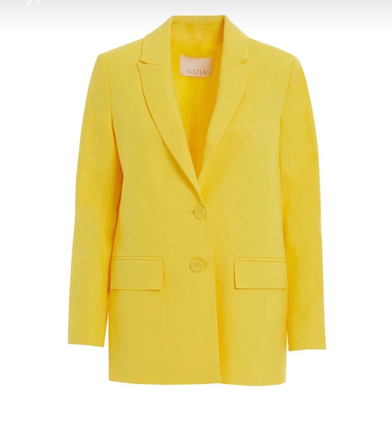 Sarı kumaştan yapılmış, düğmeli, notched lapel yaka ve uzun kollu kadın blazer. Orta uzunlukta, parlak yüzeyli, iş ve sokak modasına uygun.