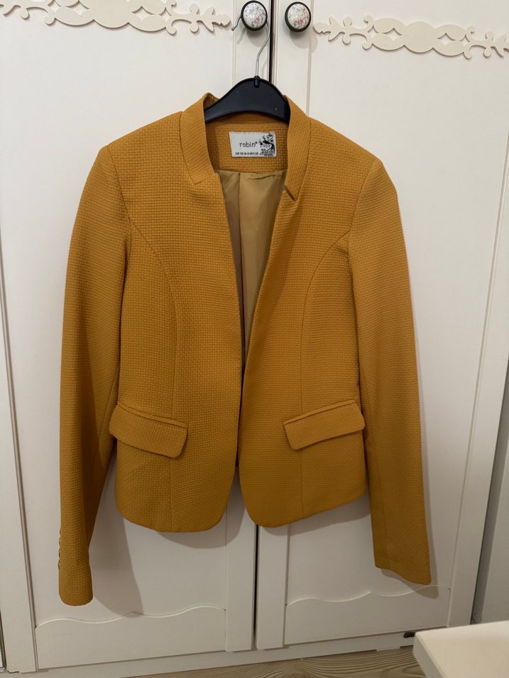 uzun kollu sarı kadın blazer ceket, normal boy ve parlak görünüme sahip. Notch yaka ve sade tasarımıyla ofis ve günlük kullanıma uygun. Düğmesizdir.✨