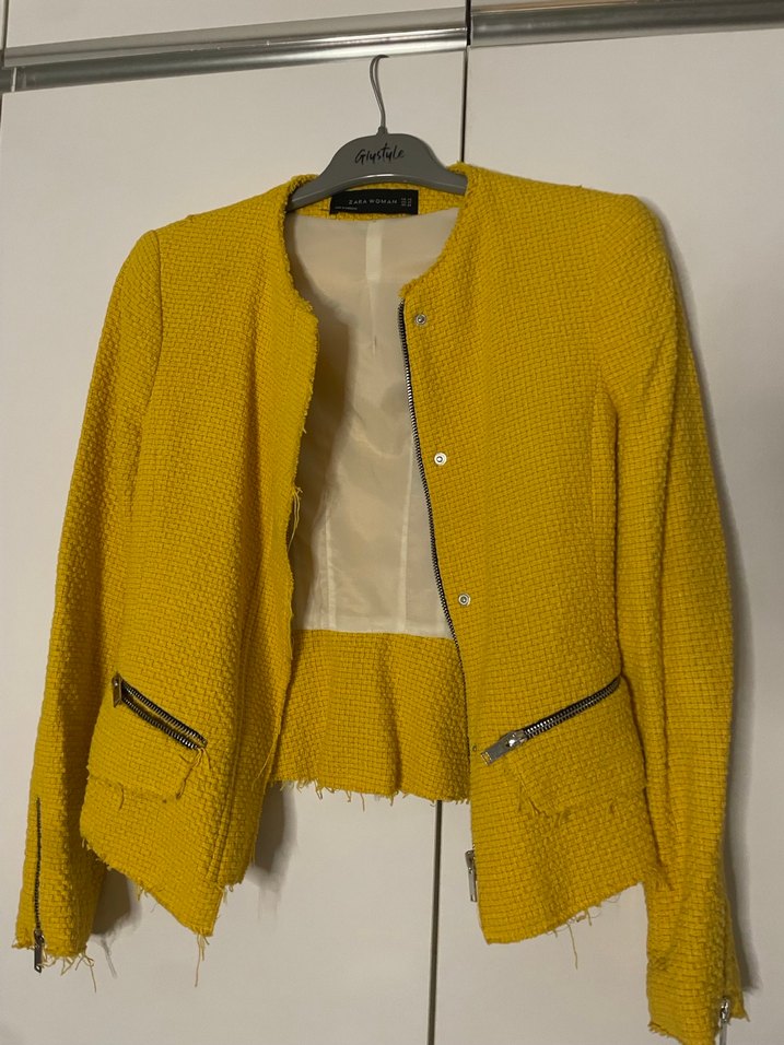 Sarı,düğmeli kadın ceketi. Uzun kollu, desen içermeyen, Paris sokak modasına uygun günlük kullanıma uygun.