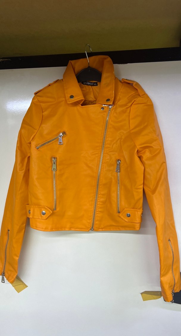 Zipperli, fitted kesim, uzun kollu sarı deri biker ceket. Notlu yaka ile renkli ve rahat sokak stili sunar. üründe. leke vardır