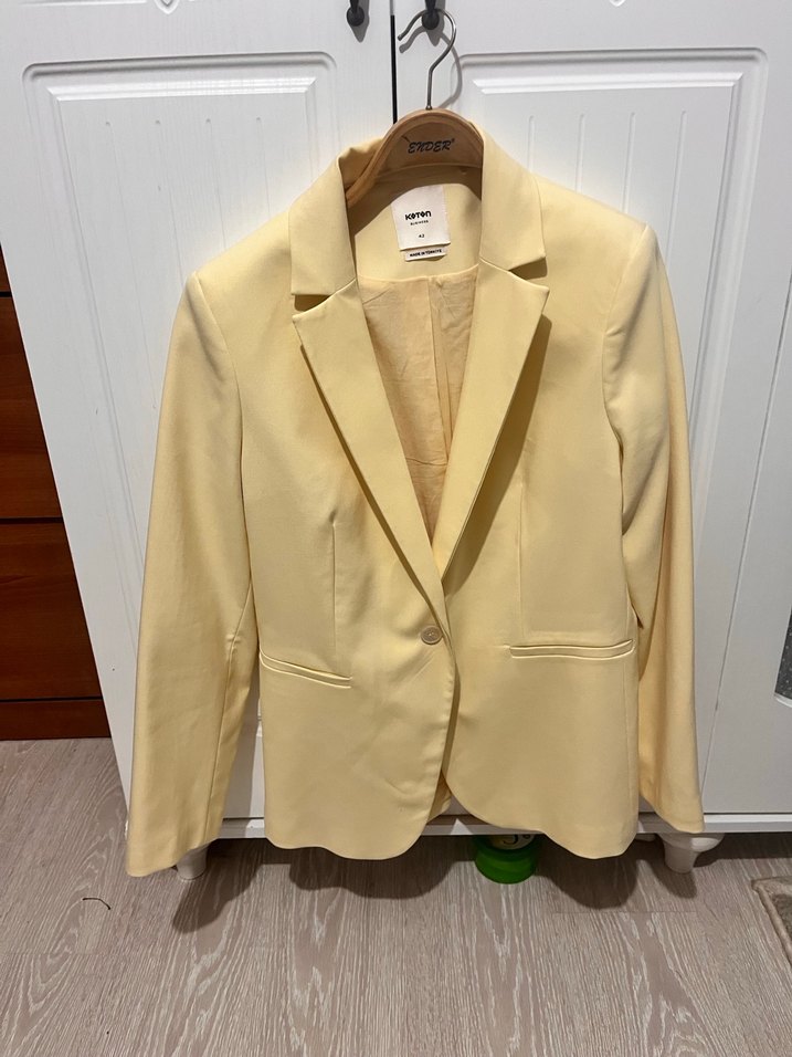 Sarı renk, düğmeli, normal boy midi blazer. Notch yaka, uzun kollu, ipeksi dokulu, ofis için uygun.hiç giyilmedi etiketi düşmüş